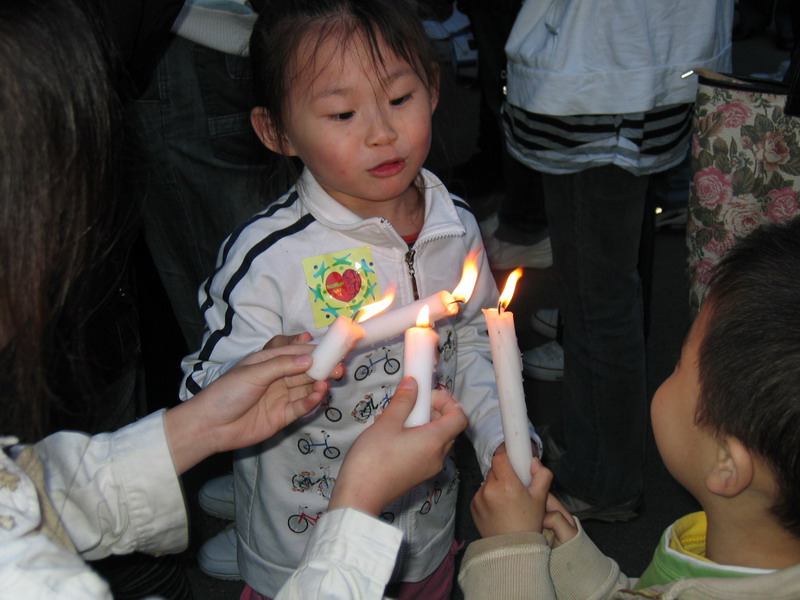 他们一起点燃烛光。为灾区同胞祈禱\!