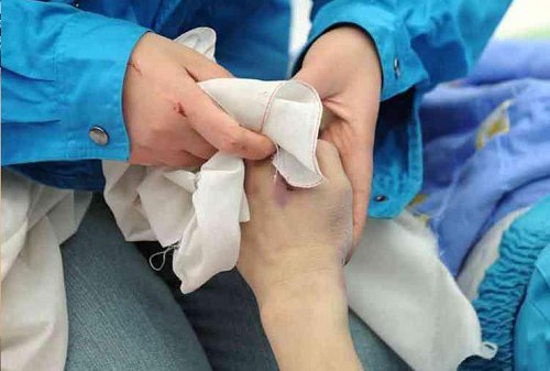 5月13日夜,德阳东汽中学教导主任兼政治老师谭千秋的妻子张关蓉在为丈夫擦拭。在地震发生的那一刻,谭千秋张开双臂护住4个学生,为这4个孩子赢得幸存的机会.
