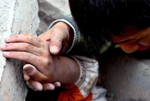 5月13日,预备役民兵和消防战士在四川德阳地区绵竹市汉旺镇武都小学废墟上抢救幸存的小学生。救护人员握住一位压在砖石中学生的小手,进行安慰。地震发生后该小学500多名师生只有200多学生侥幸逃离,数百名学生被埋在倒塌的校舍中。