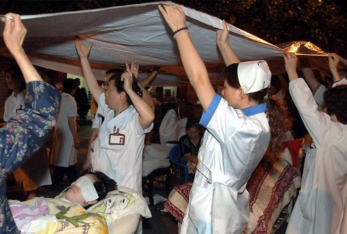 5月12日,汶川发生地震后,成都的医护人员撑起双手为“街头病房”搭建临时抗震棚。