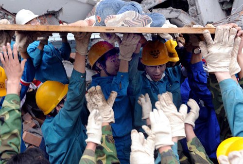 5月13日,四川绵竹县汉旺镇抢救现场,救援人员托起一位刚刚从废墟中救出的幸存学生。