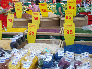 在合艾一家超市見到的米,有綠色、藍色、黃色、棗紅色,中間的那一種更抵死,淺藍、粉紅及白混色。