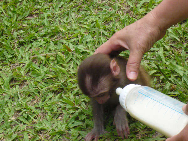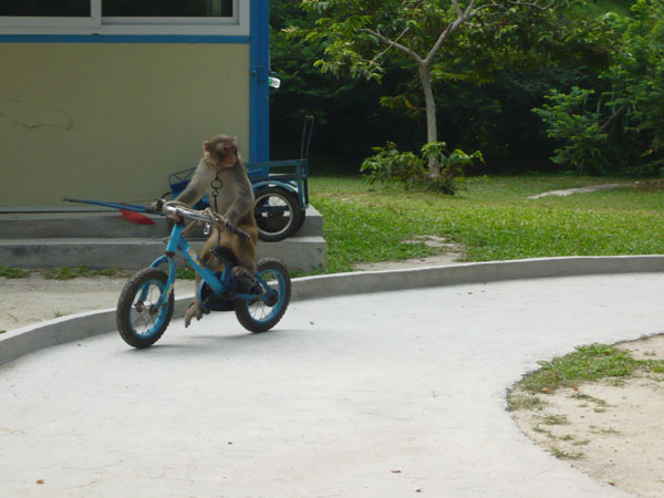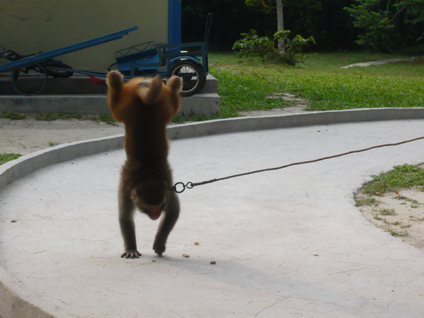 位于岛内的最北端,有个沙螺湾原始次生林.面积约三万亩,山上沟壑幽深,怪石林立,溪水潺潺,林深树密,叶茂枝虬。其内栖息着五千多只妙趣横生的猕猴和其他一些珍稀动物,是开展探险及“森林浴”的良好场所。我们来到猕猴保护区,管理人员告诉我们,当太阳将落山时,猕猴会随着口令的发出而回来保护区进食晚餐,场面非常的壮观,可惜我们去的不是时候,没有见到这场面,等下次吧...这是受过训练的猕猴表演妙趣横生的节目,首先翻个跟斗容易些。