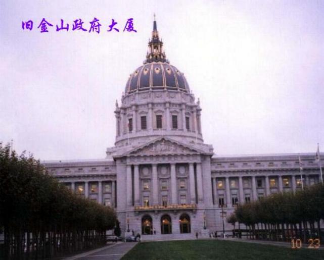 傍晚,我们来到旧金山最后一个景点参观,市政府大厦,加州政府大厦,旧联合国总部(1945年联合国宪章就是在此签署),借着暗淡的日落余辉,我们只能随着导游手所手的方向遥望,呵~~跟团旅游就是这样啦,每个景点都是匆匆走过,如蜻蜒点水,不可能随心所欲的尽兴去欣赏,不过全程有车接送食宿无忧也悠哉.(市政府大厦图片).