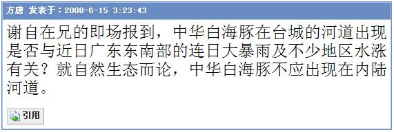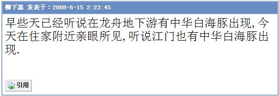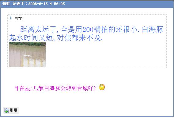 BigPaul: [/quote] 谢谢BigPaul对白海豚的外形特征、生活习性的解释.使我们得知白海豚的相关资料.